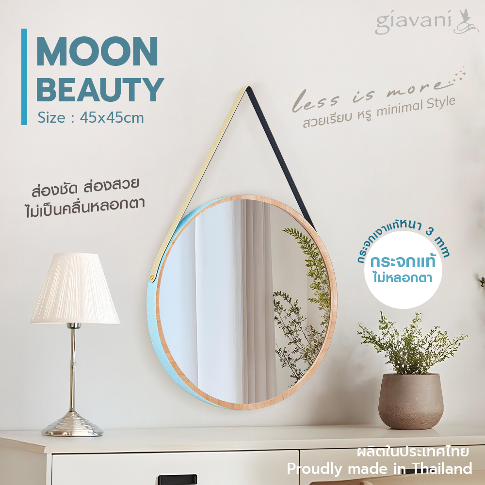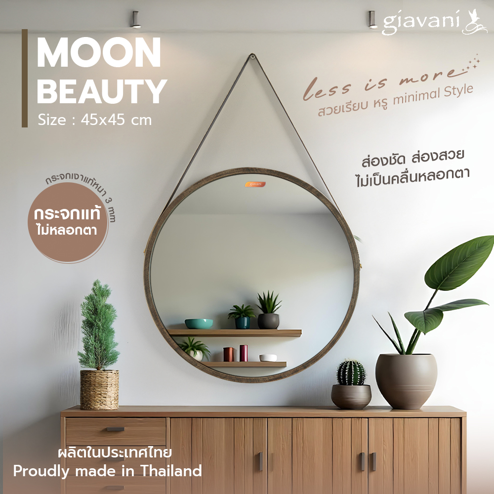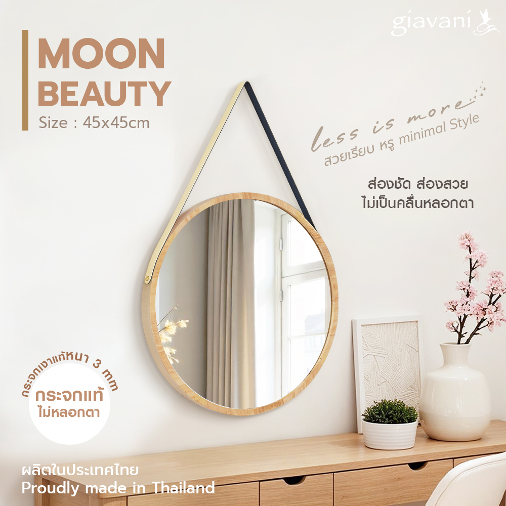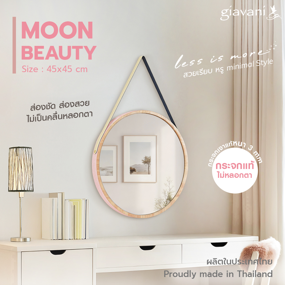 กระจก Moon Beauty แบบมีสายหนังคล้อง/มีหูแขวน ติดผนัง ขนาด 45 cm.Made in Thailand